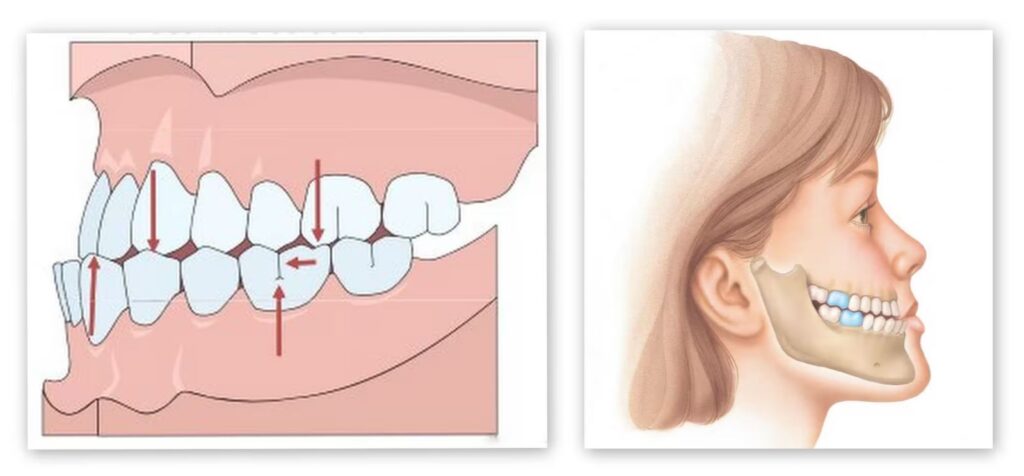 เกิดจากกระดูกขากรรไกร ขนาด รูปร่าง หรือขากรรไกรทั้งสองข้างเจริญเติบโตไม่เท่ากัน อาจนำไปสู่ภาวะฟันล่างคร่อมฟันบน คางยื่น สบฟันไม่พอดีได้